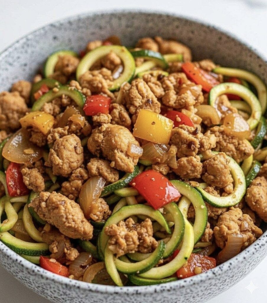 5️⃣ Toss in the zucchini noodles (or cauliflower rice) and cook for 2–3 minutes until heated through.