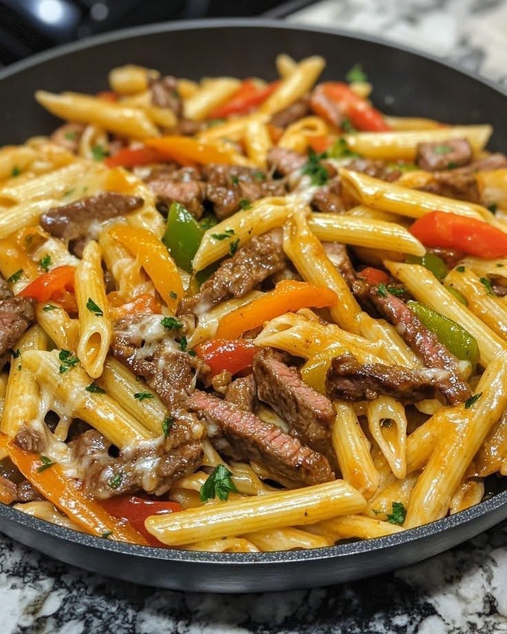 This Philly Cheesesteak Pasta combines tender steak strips, sautéed peppers and onions, and a rich cheesy sauce tossed with pasta for a comforting one-pan family dinner.