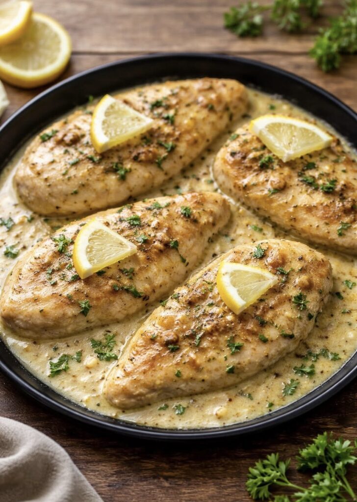 Sprinkle with fresh parsley and top with lemon slices before serving.