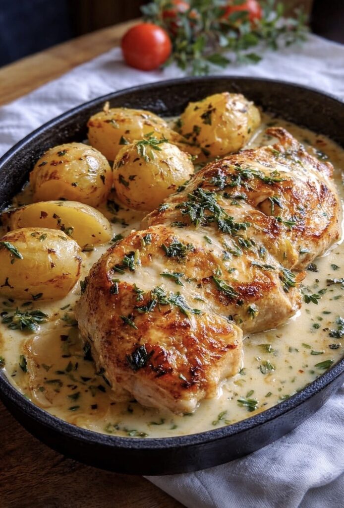 This creamy garlic butter chicken with golden baby potatoes is a rich and comforting meal that tastes like something you’d order at a restaurant. Tender chicken is seared until golden, then simmered in a silky garlic cream sauce with herbs and perfectly sautéed potatoes. It’s an easy one-pan dinner the whole family will love.
