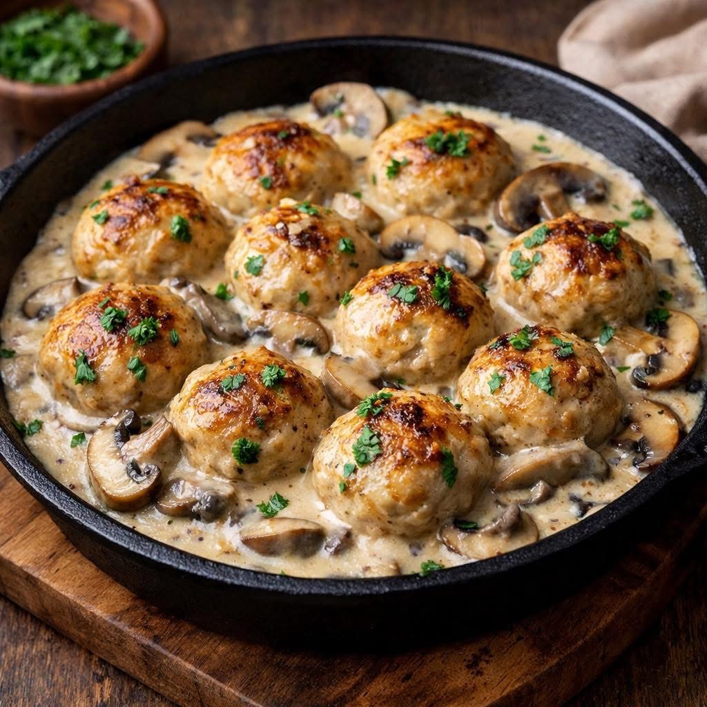 These creamy mushroom chicken meatballs are tender, flavorful, and simmered in a rich mushroom cream sauce. This comforting dish is perfect for family dinners and pairs wonderfully with pasta, rice, or mashed potatoes.