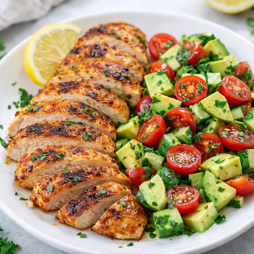 Slice the grilled chicken and serve it with the fresh avocado salad.