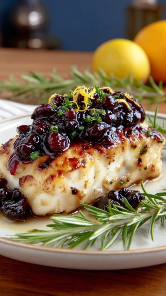 This Cranberry Orange Grilled Cod is a fresh and elegant seafood dish featuring tender grilled cod topped with a bright cranberry-orange sauce. The sweet and tangy sauce perfectly complements the mild flavor of the cod, while fresh rosemary and garlic add a delicious aromatic touch.