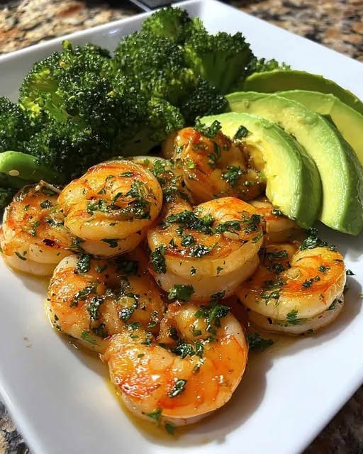 Juicy shrimp sautéed in garlic butter are paired with fresh steamed broccoli and creamy avocado slices, creating a nutritious combination of lean protein, healthy fats, and fiber.
