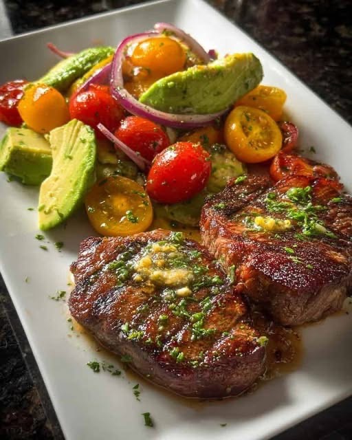 This Garlic Butter Steak with Avocado Tomato Salad is a balanced and flavorful meal combining juicy pan-seared steak with a fresh avocado tomato salad.