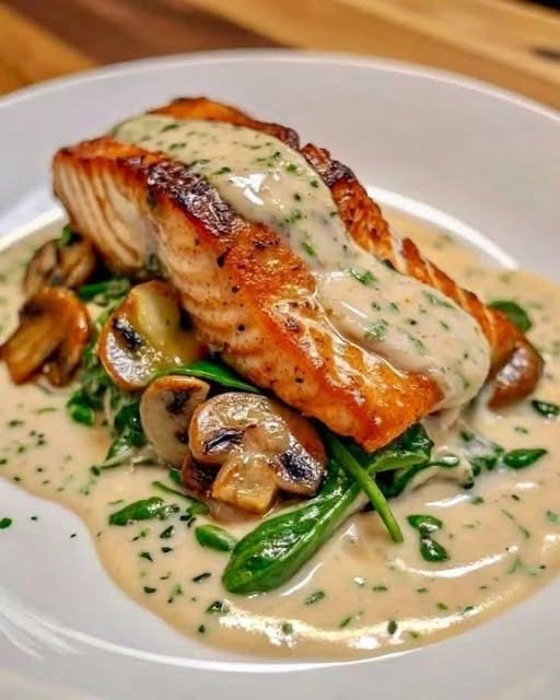 This Creamy Garlic Salmon with Spinach & Mushrooms is a rich yet balanced meal combining tender pan-seared salmon with sautéed mushrooms and fresh spinach in a smooth garlic cream sauce.